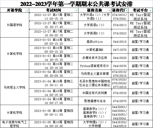 1.本学期大学外语.大学英语.马克思主义基本原理.中国近现代史纲要.思想道德与法治.毛泽东思想和中国特色社会主义理论体系概论.计算机基础.大学物理.高等数学公共类课程由教务处统一安排,于第17周、18周进行,具体考试课程及时间安排详见下表,张澜学院自行安排考试。