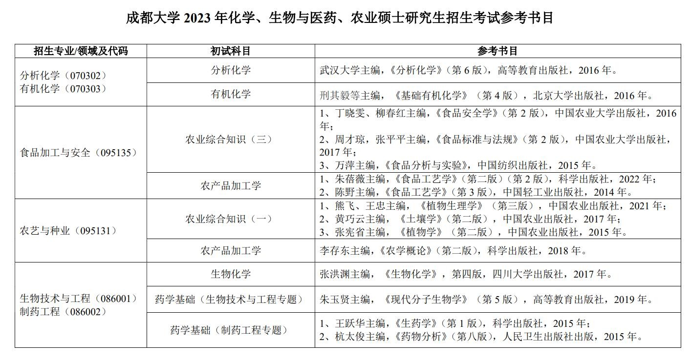 禁忌书屋 2023年化学、生物与医药、农业硕士研究生招生考试参考书目