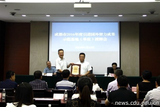 本网消息(文、图/廖菁)9月13日下午,2016年度成都市市级引进国外成果示范基地(单位)授牌会在成都市政府召开。校长王清远参会,并代表学校接受“2016年度成都市市级引进国外智力成果示范基地”牌匾。在11家入选单位中, 禁忌书屋