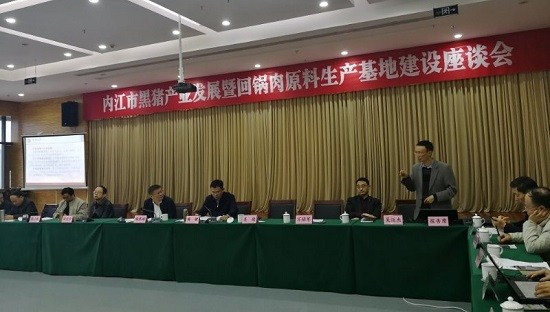 2017年10月25日,肉类加工四川省重点实验室专家团队应内江市政府邀请,与四川省生猪产业体系创新专家团队到资中等地,深入生猪育种、养殖、饲料生产、肉品加工企业考察调研生猪产业发展现状,针对产业链关键环节存在的技术瓶颈开展现场咨询服务。在此后召开的“生猪产业发展暨回锅肉原料生产基地建设座谈会上”,重点实验室首席专家王卫教授做专题报告,就目前国内外肉类产业加工技术进展和产品开发进行介绍,并就四川省生猪产业加工技术发展路径,特别是针对消费市场对优质安全肉制品的发展需求开发黑猪肉产品进行了分析和建议。