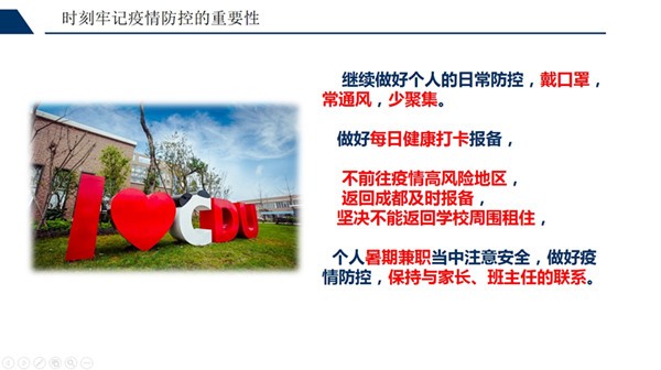 大运同行’主题活动,个人思想站位高”。专业同学积极支持服务大运村的各项工作任务,顺利完成了既定工作任务。在大是大非面前要坚定个人站位,坚决支持党和国家的各项决定。第四,“继续做好疫情防控的常态化”。暑假即将到来,同学们要继续做好常态化的疫情防控工作,坚决落实国家学校的各项防控工作。