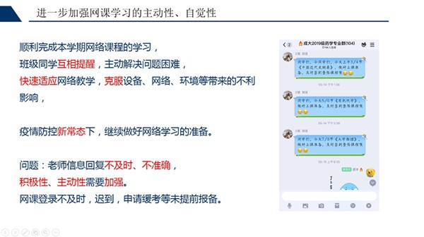 班主任邵洋老师,首先介绍了“贯彻落实党和国家防疫工作精神,坚决执行学校学院疫情防控指示要求”。肯定了班级同学在疫情防控期间做好各项工作,没有出现安全隐患。同时也存在一些问题,例如健康打卡不及时、准确性需要提高等。第二,“做好线上课程学习,顺利完成本学期学业”。本学期专业同学快速适应网络教学,克服设备、网络、环境等带来的不利影响,顺利完成了各项的学业。同时也存在一些问题,例如,信息回复不及时、不准确,积极性、主动性需要加强。网课登录不及时,迟到,申请缓考等未提前报备。第三,“积极参与‘青春有我