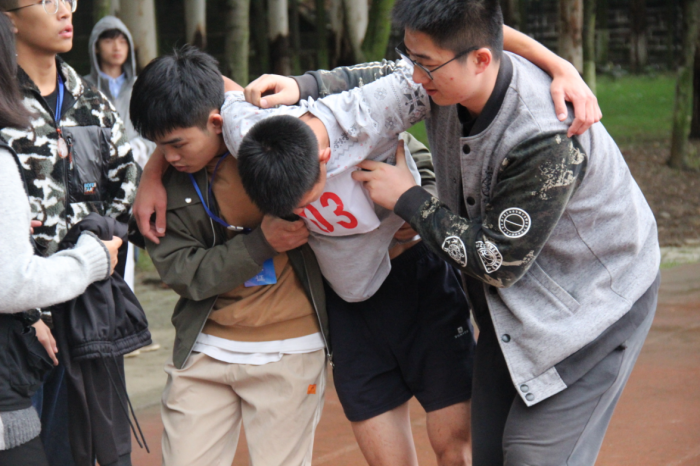 陶森柱奋力拼搏,不负众望,一举夺得冠军。冲过终点线的他已经非常疲惫,图为分团委学生会工作人员正在搀扶陶森柱。