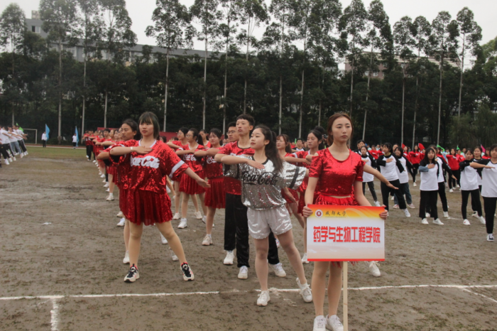 方队由学院领导在前共同手持“药学与生物工程学院”横幅和紧随身后的老师与健美操队伍共同组成。
