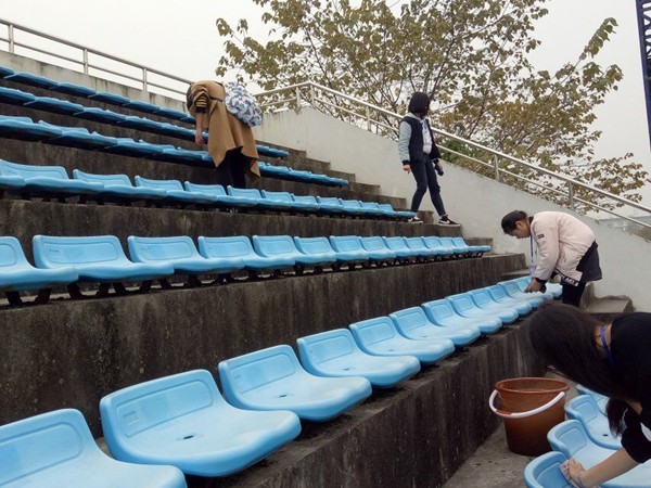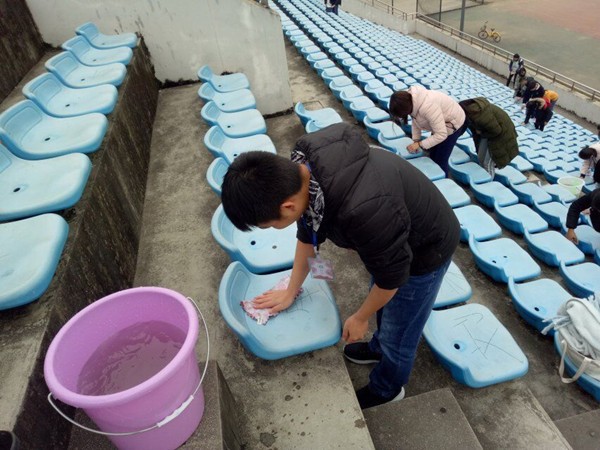 药学与生物工程学院志愿者工作部带领学院二十名志愿者们来到体育场,利用午休时间打扫看台部分观众席。志愿者们带来自己宿舍的水桶、抹布、扫帚等清洁工具,仔细清理观众席上每一角落。虽然天气严寒,但志愿者们毫不犹豫的挽起袖子在冷水里打湿抹布,一个位置一个位置的仔细擦拭,手被冻得通红却都干劲十足。经过大家一中午的认真打扫,原本垃圾遍布、灰尘堆积的观众席焕然一新。