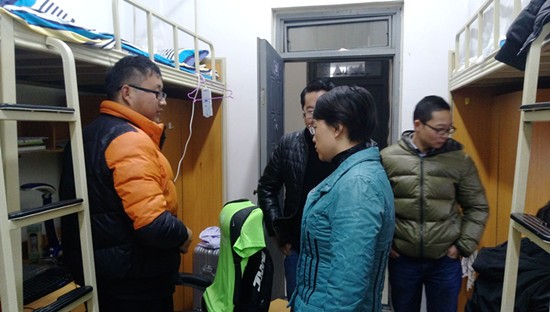 党委副书记李行及学工办各位老师,来到新生寝室,了解同学们在寝室内的学习生活情况,鼓励同学们维护好自己生活的环境,要不断的汲取专业知识和提高自身素质能力。同时,在学习之余,积极参与体育运动锻炼。面对近期入冬已久,各位老师叮嘱同学们一定要注意冬季消防安全, 切勿使用大功率电器。
