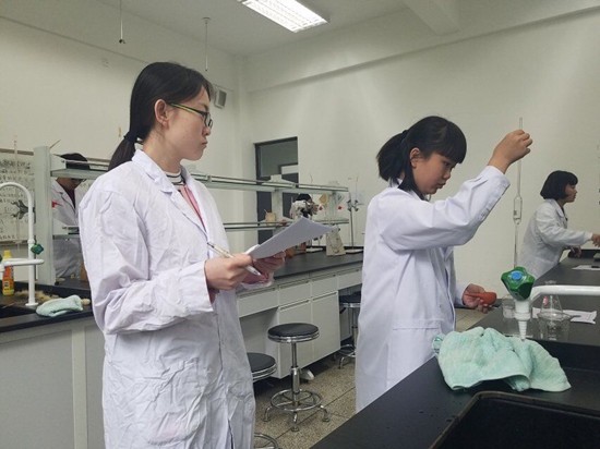 接下来,就是分组进行本次比赛的题目“混合碱的滴定”。混合碱的滴定是采用双指示剂方法,对溶液的可能成分氢氧化钠、碳酸氢钠、碳酸钠一种或几种进行定量分析。这也是我们分析化学的基础实验,大家都非常熟悉。本次比赛对参赛者实验室规范、标准溶液的滴定操作、实验结果三个方面进行评分。同学们竭尽所能的减少误差,每一个人都专注的盯着锥形瓶里溶液的颜色变化,精准的控制滴定管开关,每一个动作都小心翼翼。