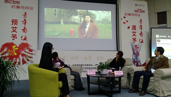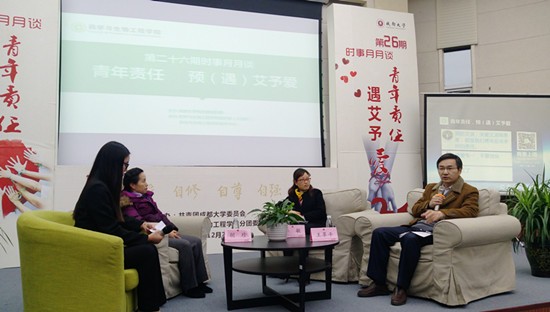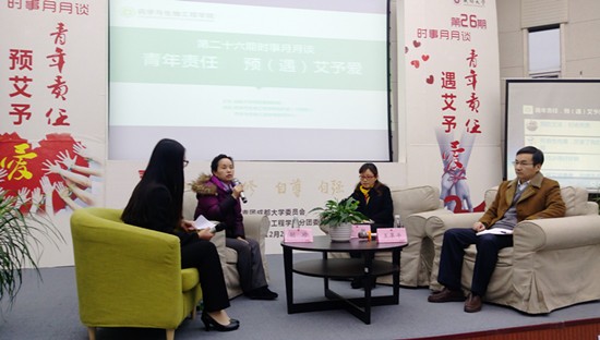 12月20晚,由药学与生物工程学院承办的第26期时事月月谈在九教演播厅举行。本期“时事月月谈”的主题为“青年责任 预(遇)艾予爱”,旨在促进青年大学生对艾滋病的预防和了解,同时给予艾滋病人更多关怀。本期邀请的嘉宾分别为师范学院胡珍教授,龙泉驿区疾控中心李敏科长,以及校医院王革平院长。