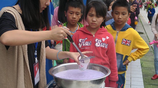 下午两点半,在志工部全体人员的准备工作完成后,孩子与家长们早早的来到了活动现场。志愿者们为他们分发气球和糖果,活动以一段小鸡舞的形式正式开始。孩子们在活动中通过参加“你比我猜”游戏环节与家长共同努力获得食材。然后进行布丁制作环节,在志愿者的讲解下,在孩子与家长的积极配合参与与耐心等待下,每组家庭都吃到了自己制作的布丁。为了感谢家长和孩子们的参与,志工部还现场制作了紫薯椰奶西米露与家长孩子分享。孩子们十分喜欢,家长们也很有兴趣学。活动在一片椰奶香中结束。