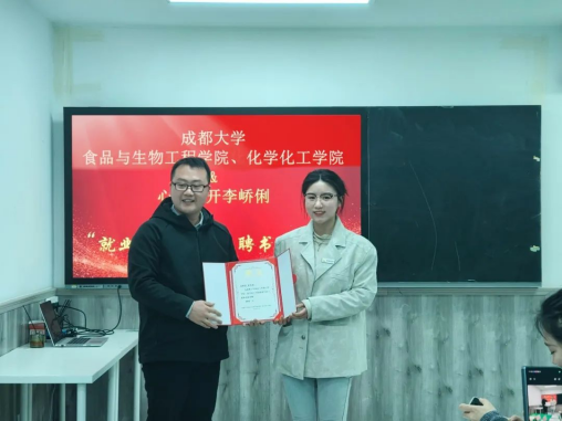 向公司人力资源部校招负责人、学院2020届校友李峤俐老师颁发“职业生涯与就业创业导师”聘书,向公司授牌“大学生就业实习基地”。
