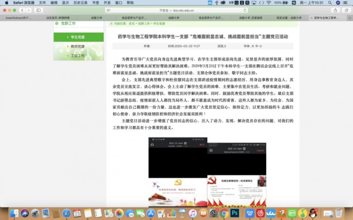 三、学院党委召开专题会议,总结主题党日活动成效3月23日上午9点半,学院党委召开党委中心组扩大会议,专题学习抗疫先进典型,并进行支部主题党日活动专题分享会,院班子、党委中心组成员、各支部书记、全体科级干部参加会议,会议由院长刘达玉主持。会上,与会党员同志首先学习疫情期间社会上、学校和学院涌现的先进人物和先进事迹,如成大附属医院出征湖北的医护人员先进事迹、肉类重点实验室发布的《肉制品加工企业新型冠状病毒肺炎防控指南》在全国范围应用并受科技部关注、刘涛教授团队的新冠肺炎最新研究成果在《中草药》在网络首发,这些先进典型生动诠释了“危难面前显忠诚、挑战面前显担当”的深刻含义。随后,各支部书记一一分享本支部的主题党日活动开展情况,各支部积极学习疫情期间的先进典型事例,并结合实际从线上教学、科研攻关、学科建设、地方服务和人才培养等方面进行深入研讨。刘达玉院长作总结发言,他指出,各支部深入开展“危难面前显忠诚、挑战面前显担当”主题党日活动,坚定了学院党员同志的理想信念,增强全体党员的凝聚力;同时在疫情期间,全院上下团结一心,积极投身到抗疫战斗中,线上教学、学科建设、科研工作等都更上一层楼,为打赢疫情攻坚战做出了自己的贡献,真正做到了“忠诚”、“担当”,希望全体师生党员同志、、砥砺前行,带动全院师生众志成城、攻坚克难,坚决打赢疫情防控阻击战。