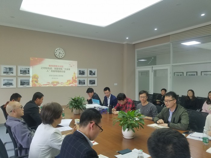 在落实“三全育人”过程中形成的育人模式,介绍了学院在落实“三全育人”过程中近期、中期、远期拟实现的目标;在深化全方位育人方面,围绕着“大文化育人”,学工办梁海鹏介绍了学生“考研文化”,并就如何提高学生考取双一流高校做了说明;邵洋介绍了学生“公寓文化”取得的一些成绩及存在的问题;游瞾介绍了学生在科创文化、体育文化、志愿者服务文化等第二课堂育人工作及存在的问题。