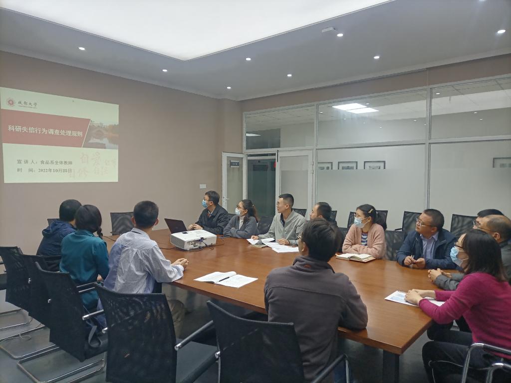 为贯彻实施《中华人民共和国科学技术进步法》等法律法规,进一步规范科研失信行为调查处理工作,11月上旬,学院科技办组织食品系、生工系、实验中心、药学系、化学化工系、肉类加工四川省重点实验室、农业农村部杂粮加工重点实验室科研人员认真学习了科技部会同科研诚信建设联席会议成员单位(二十二部门)发布的《科研诚信案件调查处理规则(试行)》(诚信办〔2022〕1号)。