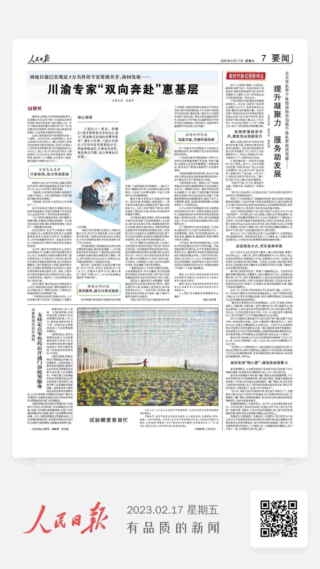 川渝自古一家亲,自2020年重庆市专家服务中心与四川省专家服务中心签署《川渝专家资源共享协议》,成立“成渝地区双城经济圈专家团”以来,川渝两地院士、各行业领域学术技术带头人、博士后科研人员等专家积极参与服务团活动,助力双城经济圈建设,在信息技术、智能制造、新材料、人口健康、农业等多个领域,惠及基层干部群众近6万人。