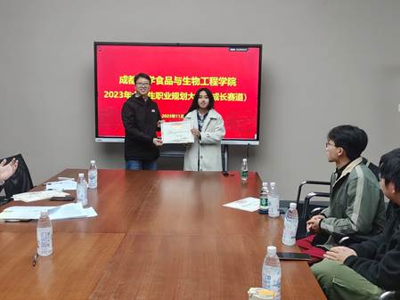 最后,李云成副书记对本次比赛进行了点评、讲话。第一,提升综合素质能力。本次比赛是很好的锻炼机会,确定了个人需要积累什么能力,思考将来要做什么工作,希望同学们今后在学习工作中不断积累锻炼;第二,积极准备,自信大方。站在比赛的舞台上同学们要提前做好各项准备,同时在讲台上自信大方展现出个人风采;第三,凝练特色,聚焦方向。同学们要根据个人情况凝练自己的生涯规划方向,做到“人无我有,人有我优”。在凝练过程中找到个人发展方向珍惜大学校园成长发展的平台。雷茹心、王美心等8名同学分获一、二、三等奖,学院党委副书记李云成老师为获奖选手颁奖。