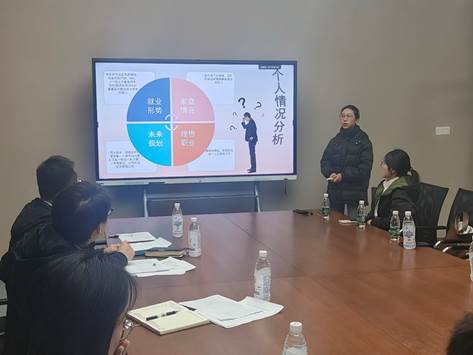2023年大学生职业规划大赛成长赛道、就业赛道决赛评分标准》,参赛同学得分由《职业生涯规划》路演PPT、结构化面试两部分构成。随后比赛正式开始,参赛同学分别通过个人路演PPT从自我评估分析、职业认知、目标确立、计划实施、计划应对等方面进行介绍。结构化面试部分着重考察了参赛同学在语言表达能力、举止仪表、理论素养以及逻辑思维能力等。