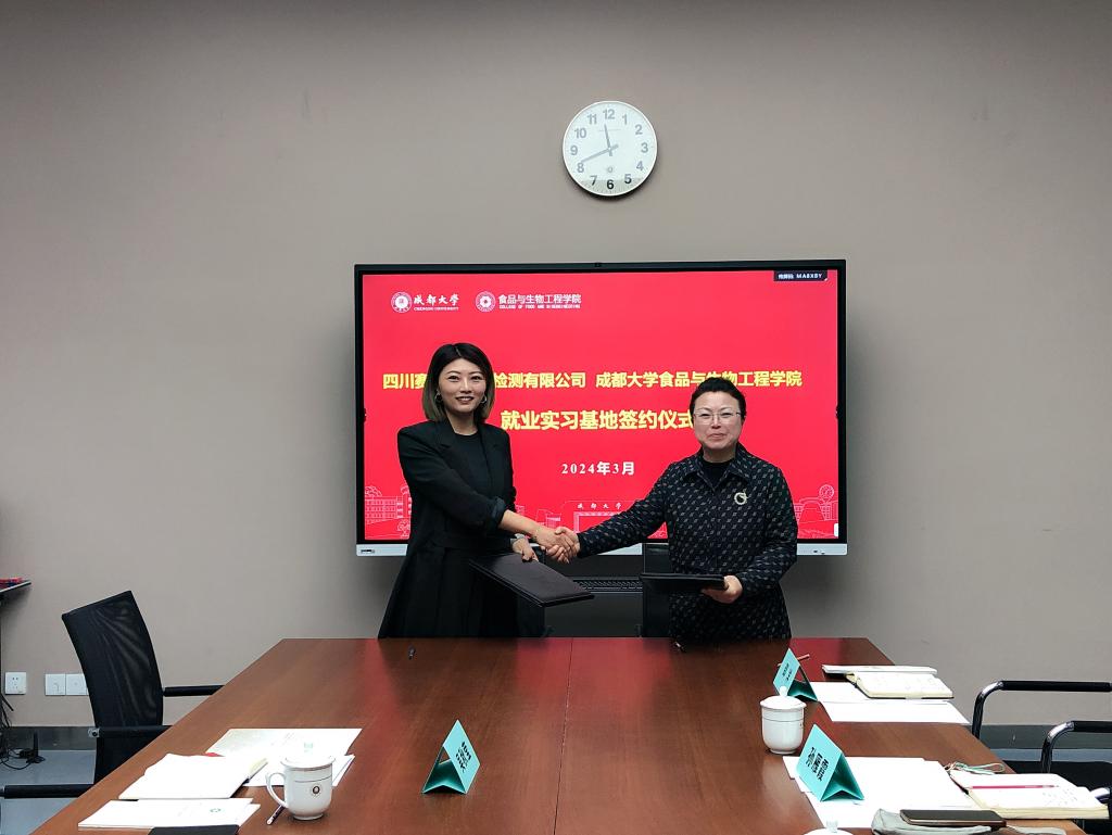 党委书记孙雁霞与四川赛纳斯分析检测有限公司总经理吴秋莹现场签订共建实习实训基地合作协议。
