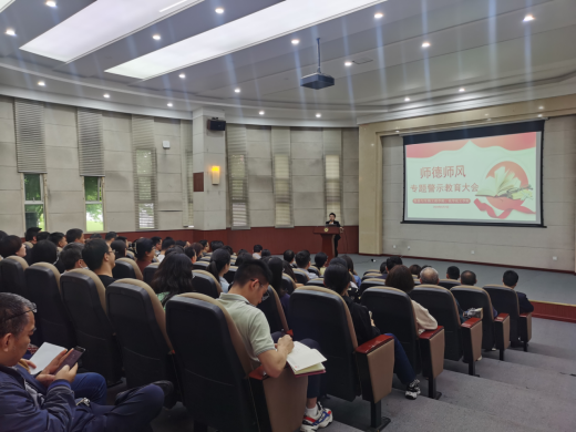 在09D208演讲厅召开师德师风专题教育警示大会,学校党委常委、院长刘达玉出席会议并讲话,全体班子成员及全院教职工参会,会议由院党委书记孙雁霞主持。