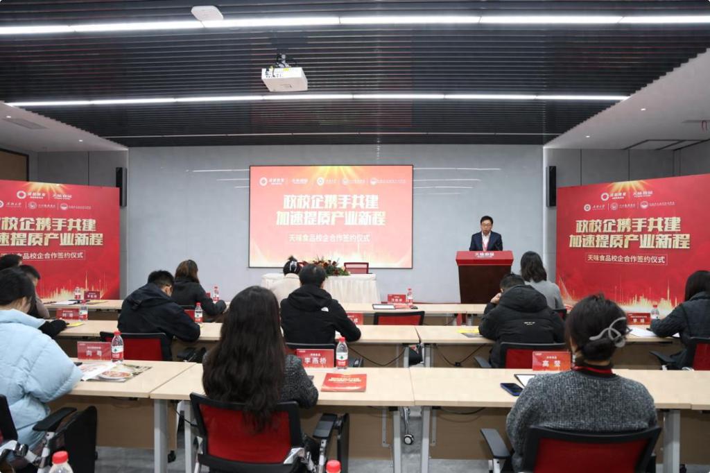 为共建“四川省复合调味品产业学院”成立揭牌,双方将开展从人才培养目标共研到人才共评的“七共”人才培养模式,在企业设立研究生、本科生实习基地。同时,双方联合科研机构,探索共建创新联盟与研发中心,推进新技术、新工艺研发,共同建设国家级、地方重点科技项目,构建“智库—培训—公益”服务体系,促进科技成果转化与应用,服务产业升级。天味食品与四川旅游学院将合作开展行业标准制定与新品研发,共同举办行业头部活动、赛事。天味食品与成都农职院将合作开发人才培养方案、课程资源,开展“双师型”教师队伍建设,开展职业能力提升培训。