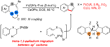 该研究创新性地开发了一种钯催化α-溴代烯烃迁移环化反应的新策略,成功实现了包括膦杂吲哚在内的多种苯并杂环化合物的高效合成。与传统的合成方法相比,该策略无需预先在芳环邻位引入卤素或金属基团,大大简化了合成步骤,提高了原子经济性。研究过程中,团队意外发现反应并非按照预期的氧化加成/1,4-钯迁移/芳基钯化路径进行,而是通过独特的反式1,2-金属迁移机制完成。这一发现不仅丰富了金属迁移反应的理论体系,还为复杂杂环化合物的合成提供了新思路。特别值得一提的是,研究团队还成功开发了该反应的不对称催化版本,实现了P-手性中心的高效构建,为手性药物和功能材料的开发奠定了基础。本研究的创新性体现在三个方面:首先,揭示了反式1,2-金属迁移这一全新反应机制,丰富了迁移金属化反应的理论体系;其次,开发了一种原子经济性的苯并杂环合成策略,避免了预官能化步骤;最后,通过不对称催化实现了P-手性中心的高效构建。未来,这一方法可进一步应用于其他杂环体系合成,并有望在药物分子和功能材料开发中发挥重要作用。