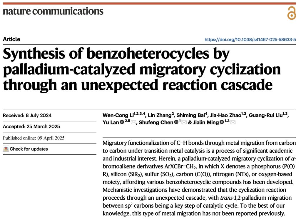 天然产物化学生物学交叉科技创新团队明佳林研究员在国际顶级学术期刊Nature Communications(《自然·通讯》)上,发表题目为“Synthesis of benzoheterocycles by palladium-catalyzed migratory cyclization through an unexpected reaction cascade”的重要论文。从2024年年底开始,明佳林研究员半年内以通讯作者连续在Nature Communications发表了三篇论文,最新的论文报道了该团队实现了膦杂吲哚及其他吲哚类化合物的高效合成。该研究工作由李文聪博士担任第一作者,明佳林研究员为主通讯作者,郑州大学蓝宇教授团队提供了重要的理论计算支持。