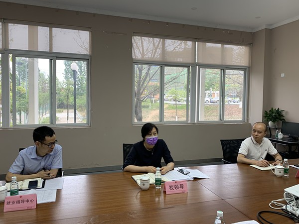 调研指导2020届毕业生就业工作,学生处负责人李维、就业指导中心蒋桂高、蔡薇薇陪同调研。药学与生物工程学院领导班子、系部主任、辅导员、毕业班班主任参会。