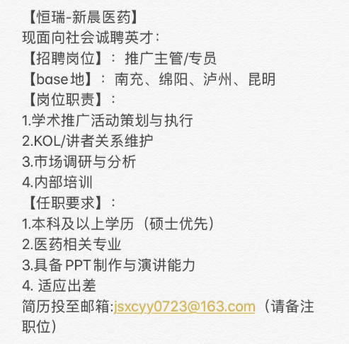恒瑞-新晨药业“推广专员”、“医学项目专员”招聘