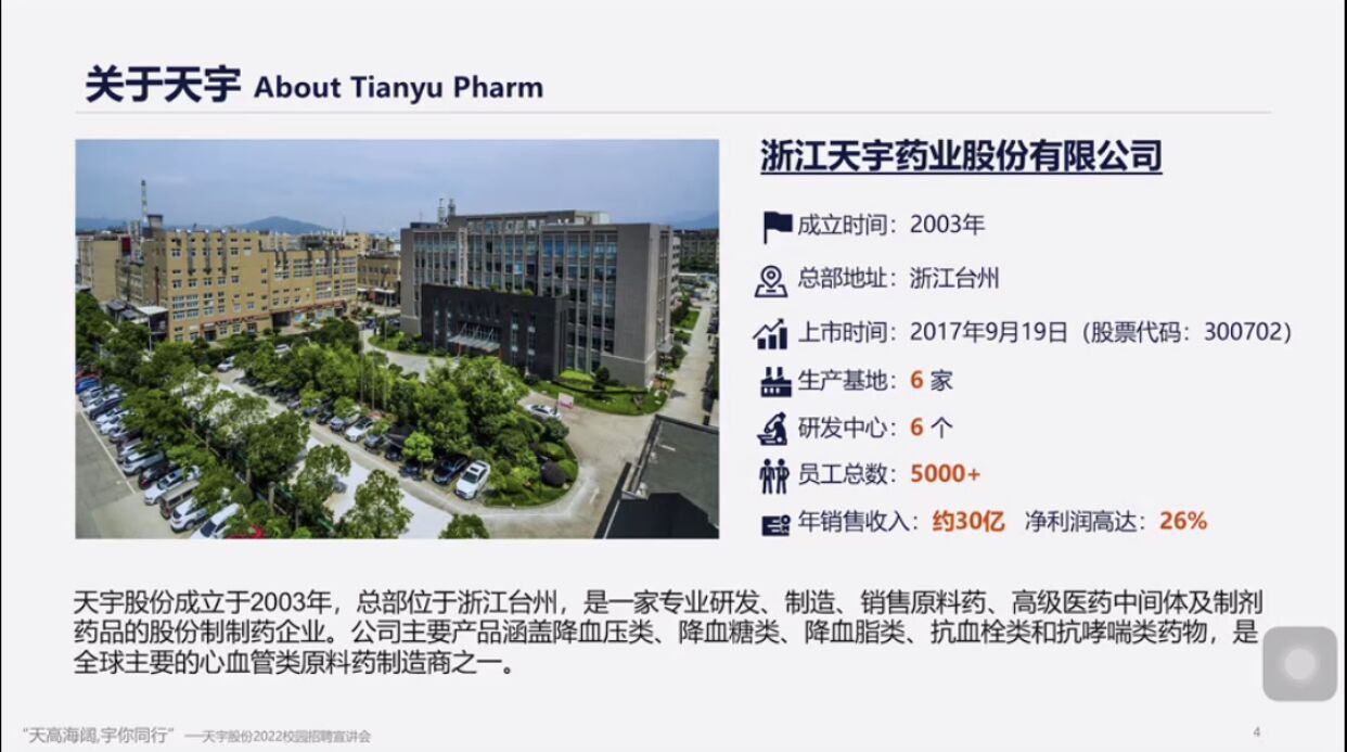 宣讲就业活动开始后,公司人事部门生经理绍到,浙江天宇药业股份有限公司成立于2003年,总部位于浙江台州,注册资金1.8亿多元,拥有6家全资子公司,现有员工4800多人。天宇股份是一家专业研发、制造、销售原料药及高级医药中间体药品的股份制制药企业,于2017年 9月19日在深交所成功上市(股票代码:300702)。公司是国家高新技术企业、浙江省创新型试点企业、浙江省专利示范企业,建有省级企业研究院、省级高新技术企业研究开发中心、省级创新载体、省级企业技术中心和省级博士后科研工作站。公司主要产品涵盖降血压类、降血糖类、抗血栓类和抗哮喘类药物原料药及中间体,是全球主要的心血管类原料药制造商之一,产品畅销海内外市场。