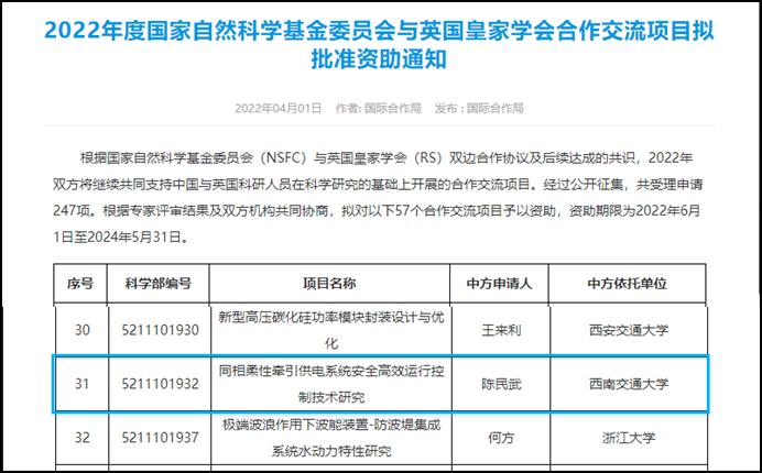 Recently, Prof. Minwu Chen and Dr. Tian Zhongbei from the University of Liverpool were awarded the NSFC-RS cooperative exchange project "Research on Safe and Efficient Operation Control Technology of Homogeneous Flexible Traction Power Supply System" as the leaders of both sid...
