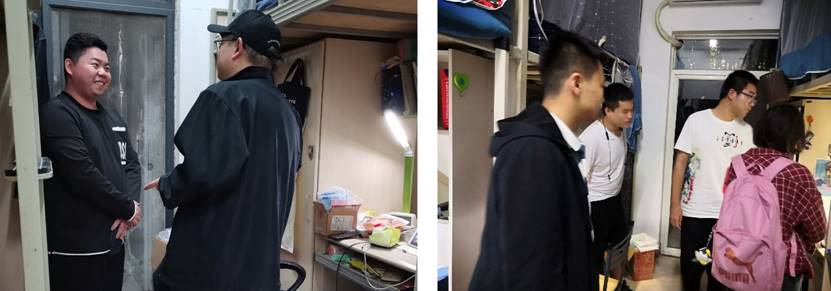 学生工作组辅导员以年级组为单位走访了学院本研学生宿舍,与学生深入交流,了解同学们学习和生活上遇到的困难,对走访时不在宿舍的同学逐一了解其具体去向。
