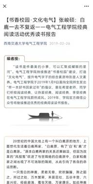 为了鼓励学子们积极参与经典阅读活动,营造学院书香氛围,学院还在官微设立了专栏,按周推送优秀读书报告。专栏的设立展示了学院建设书香氛围的决心和重视,带动了学院各个组织以及相关社团的积极性。同时,每周推送优秀读后感,一方面鼓励了学生养成爱读书、善读书的习惯,另一方面也激发了同学们的写作热情,为同学们提供了展示自我的平台和机会。