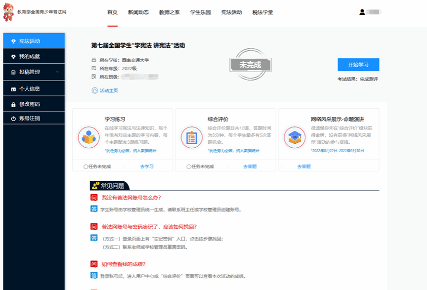 本次学习以年级、班级为单位,统一在教育部全国青少年普法网上开展,各班级应积极组织同学利用平台资源完成在线学习、课后练习、成果检测等,并于11月3日之前完成平台学习全覆盖。