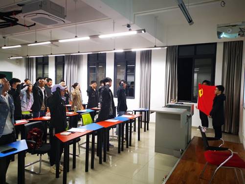 会议的最后,全体党员面对党旗进行庄严宣誓。支部书记詹睿对新一批加入中国共产党的预备党员表示祝贺,并希望在今后的学习工作中要以一名正式党员的标准严格要求自己,发挥学生党员的先锋模范作用。
