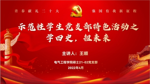 为深入学习贯彻习近平新时代中国特色社会主义思想,引领学生党员深刻领悟“两个确立”的决定性意义,增强“四个意识”,坚定“四个自信”,弘扬伟大建党精神,电气工程学院硕士2021级第二党支部于4月27日,在犀浦校区电气馆10831会议室开展了“凝聚青春力量,争做先锋电气人”系列特色活动。本次活动主要进行学习“四史”征程和观看“红色”影视两方面内容,由支部书记王顺同志担任主持,支部全体党员同志以及入党积极分子共同参加。