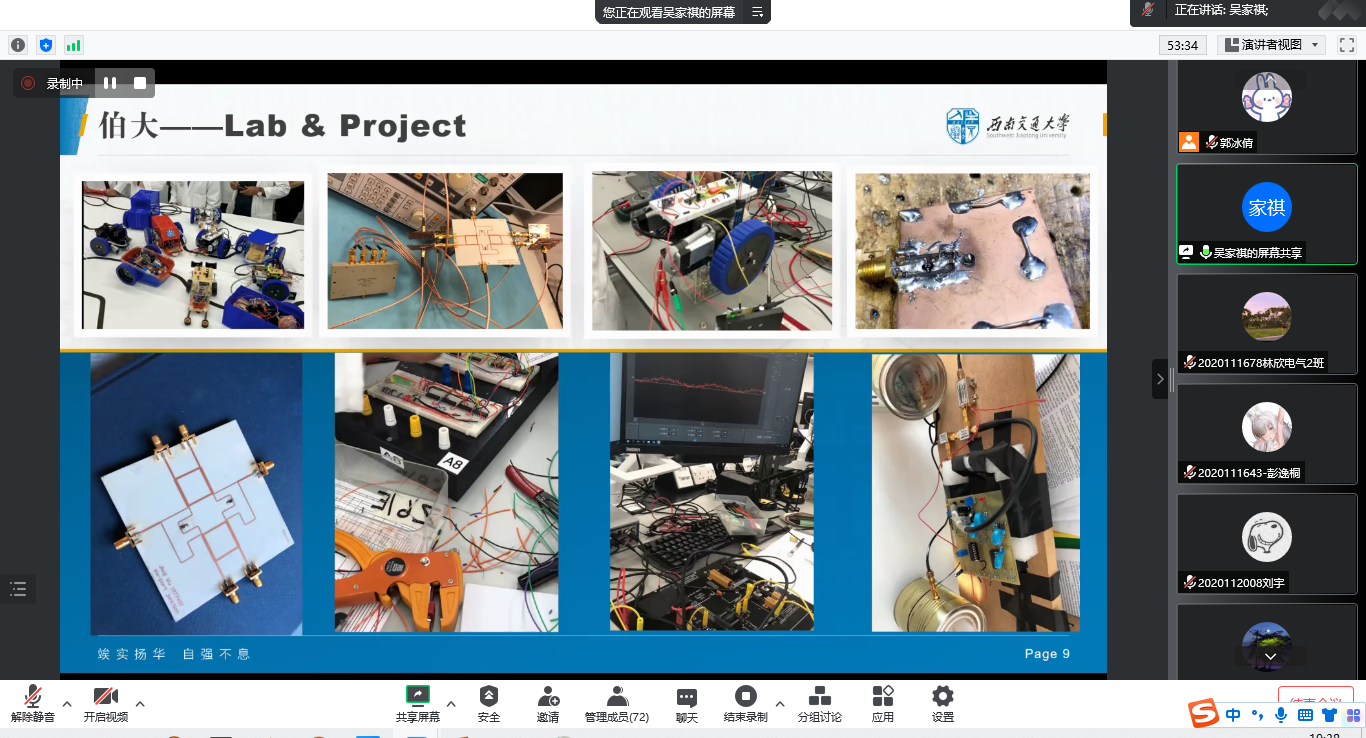 为帮助同学们更好地了解出国留学流程、做好出国相关准备,明确努力方向,8月19日晚19时30分,电气工程学院举办了“电气”脚尖,迈向世界——海外留学经验分享会。本次分享会由电气工程学院本科2020级辅导员郭冰倩主持,同时邀请了拥有丰富留学经历的本科2016级电气工程及其自动化专业的吴家祺同学和本科2018级电子信息工程专业的韦雨声同学分享自身的留学经验与心得,帮助同学们更加深入地了解留学申请流程,专业及院校选择、海外学习生活和留学就业前景等方面信息。