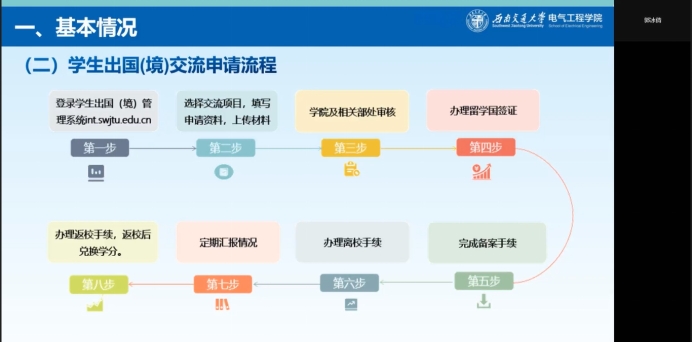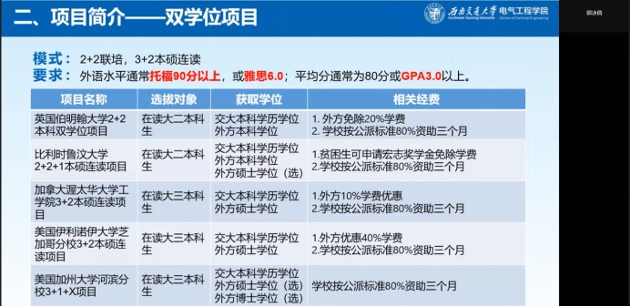 为增强学生对出国留学的认识及规划,进一步开拓学生国际视野,2022年9月25日晚7点整,西南交通大学电气工程学院在线上召开了“学在电气”留学项目推介专题讲座,学院国际人才班班主任郭冰倩对学生出国(境)相关的情况进行了介绍,电气工程学院国际人才班同学参加讲座。
