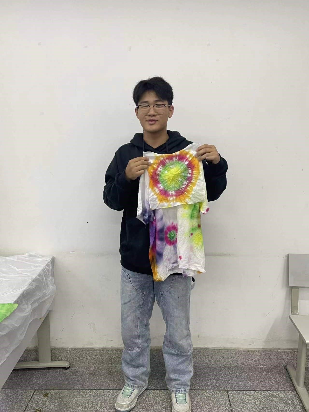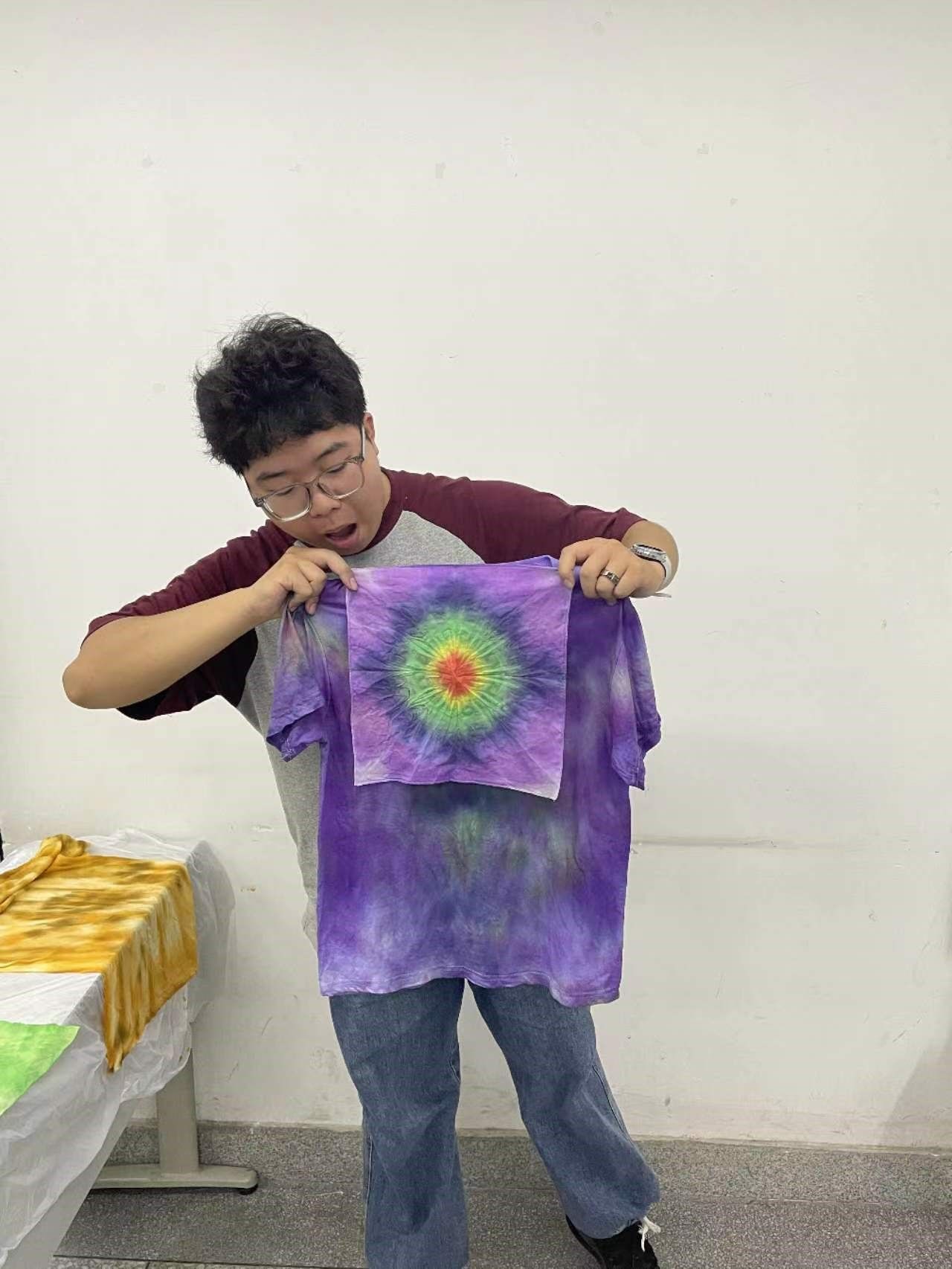 在实操中,大家互相学习,共同讨论,对自己的作品有大致的构思和想法后,一步步动手,完成了自己的第一件作品,大家在这个过程中享受了扎染的快乐但也体会到非遗作品的难度!随后同学们对自己的作品进行二次加工,也有同学直接开始自己的后续作品创作。