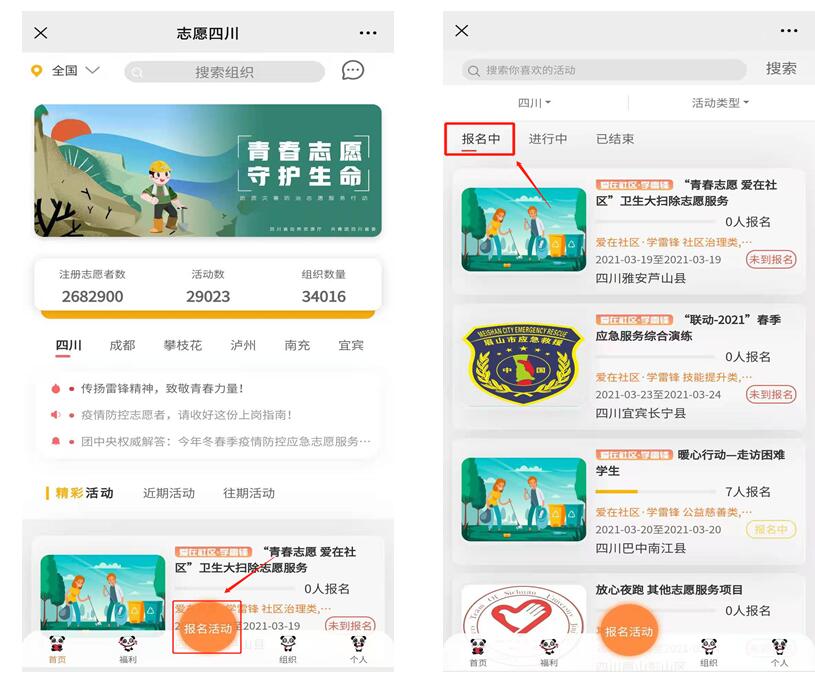 第二步:进入活动页面,显示为“报名中”的活动均可报名参加。