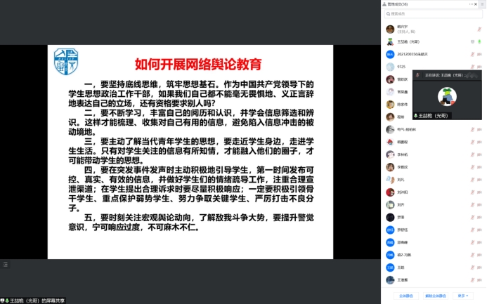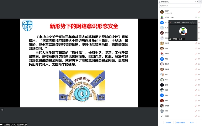 2022年5月31日晚19点30分,西南交通大学电气工程学院辅导员王喆桅老师通过腾讯会议的形式为硕士2021级2班同学开展了网络舆论安全讲座,同时邀请学院其他研究生骨干旁听。
