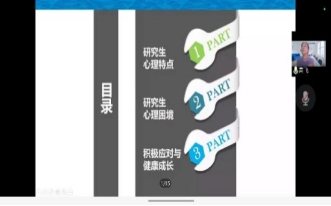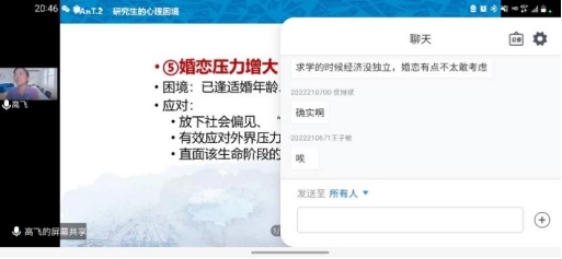 随后高飞老师从研究生的心理困境出发,介绍研究生心理状态,分析研究生常见的生涯规划紧迫、人际关系挑战、学习内容变化、经济压力凸显、婚恋压力增大等困境的形成原因及破解之法,鼓励同学们通过行动带来改变,并在线回答新生们的疑问,提升同学们对心理状况的关注,让同学们学习规划自己未来生活,学会与他人相处,妥善处理好各方面的挑战和压力。