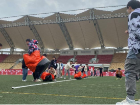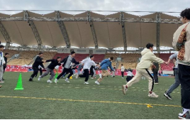 这是一个需要同学们冲刺速度和团结协作能力的一项趣味运动,它需要同学们在不出黄线的前提下,以最快的速度拉着后方的同学快速奔跑,虽然很需要领头同学的爆发力,但是如果太追求速度,出现了失误,那反而欲速则不达了,所以同学们自己掌握好其中的平衡吧!