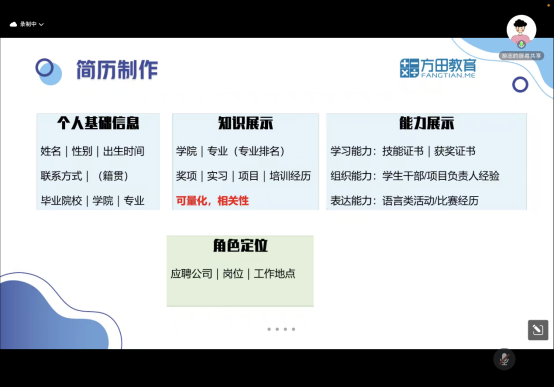 除了面试技巧,游老师还重点讲解了简历的制作。他分享了一些关于简历撰写的实践操作,包括如何突出自己的技能和经验,如何使用关键词来吸引HR的关注,以及如何格式化简历使其易于阅读。她还建议参与者根据不同的职位和公司调整简历内容,以便更好地与目标岗位匹配。