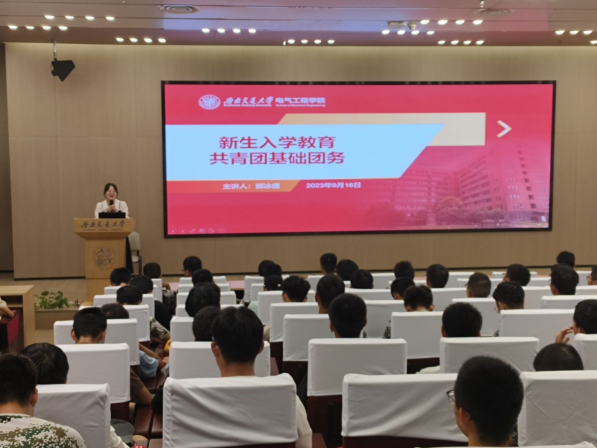 2023年9月16日晚上19:00,电气工程学院本科2023级在西南交通大学犀浦校区一号报告厅开展共青团基础团务专题讲座。此次讲座由辅导员郭冰倩老师主讲,电气学院本科2023级辅导员詹睿、罗霁轩和全体新生参与。