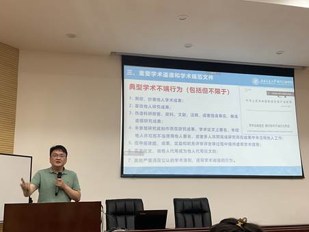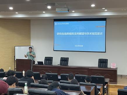 为打造“精勤研途”,传承“双严”传统,助力硕士2023级新生合理开展学业规划,学院恪守科学精神、坚守学术诚信系列教育活动于9月26日15:00在九里校区J0222开展研究生培养相关文件解读与学术规范要求讲座,副院长刘志刚教授主讲。