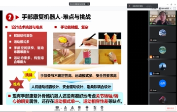 本次沙龙采用“线上+线下”的模式进行,由电气工程学院黄德青教授担任活动现场主持人,线上约80位师生共同参与,在线下,数十名对于机器人系统有着深厚兴趣和钻研的同学组成了一个观摩和研讨的小团队。程龙博士以“手部康复机器人设计、感知与控制”为题,首先介绍了自己所在的团队--中国科学院分子影像重点实验室,团队强大的人员队伍和雄厚的技术实力赢得在场所有人的赞叹。其后,程龙博士从研究背景、手部康复机器人系统设计和主被动康复训练方法三部分为同学们展开了深入浅出的讲解,既有学术的严谨又有报告的激情,在场的师生聚精会神听取,不错过任何学习的机会。