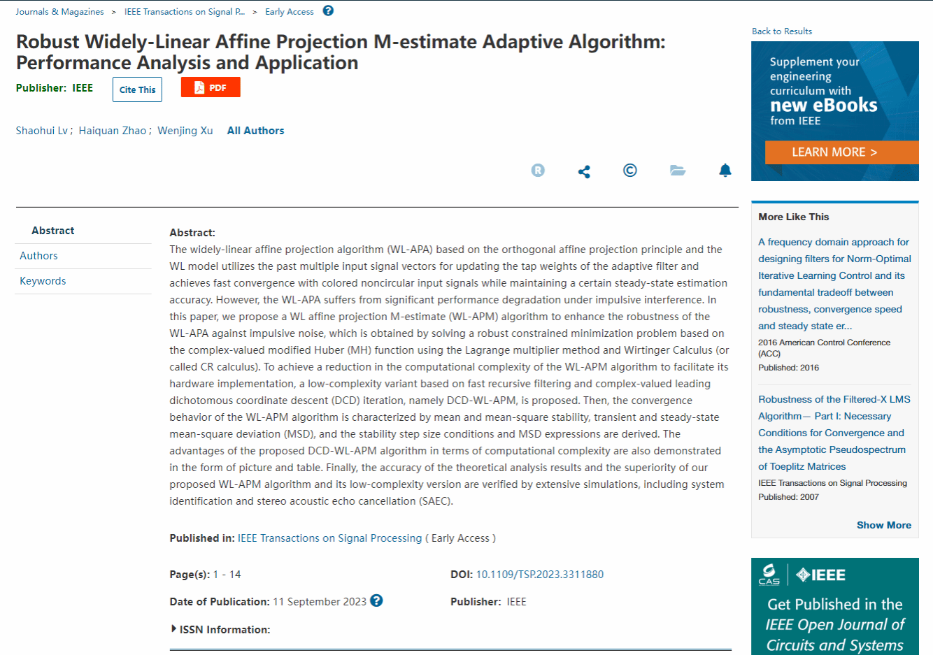 《Robust Widely-Linear Affine Projection M-estimate Adaptive Algorithm: Performance Analysis and Application》被信号处理领域顶级期刊《IEEE Transactions on Signal Processing》接受,博士生吕少辉为第一作者,赵海全教授为通讯作者。该论文研究了宽线性仿射投影算法(WL- APA)抗脉冲噪声干扰问题。在论文中提出一种宽线性仿射投影M估计(WL-APM)算法来增强WL-APA对脉冲噪声的鲁棒性。同时,为了降低算法的计算复杂度以促进其硬件实现,提出了一种基于快速递归滤波和复值主导二分坐标下降迭代的低复杂度算法,即DCD-WL-APM。并理论分析了WL-APM算法的均值和均方稳定性、理论瞬态和稳态均方偏差(MSD)性能,得到了对应的稳定步长条件和MSD表达式。最后,通过系统辨识和立体声回波抵消(SAEC)等计算机仿真,验证了所提出算法的优越性。