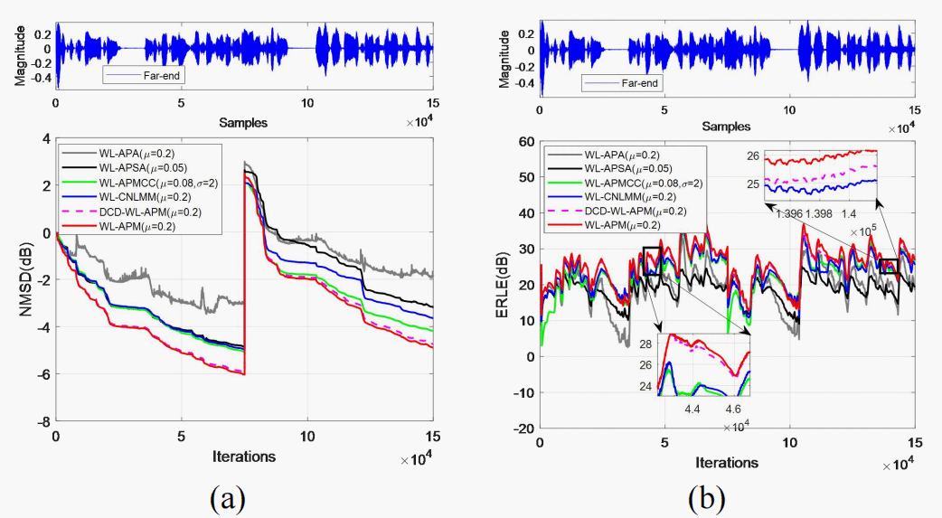 (a)不同算法的NMSD性能曲线 (b)不同算法的ERLE性能