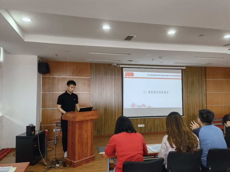 培训会最后,学生党员代表、电气硕士2019级第一党支部书记何宗伦发言。何宗伦表示,开展党史学习教育,是对全体党员的一次深刻思想洗礼,我们要坚决做到学党史、强信念、跟党走,扎实开展学院党委布置的各项特色学习活动,将党史学习与日常学习、科研相结合,激励同学们以昂扬姿态奋进前行,以优异成绩庆祝建党100周年。