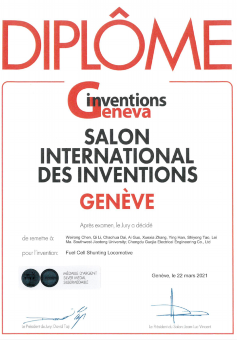 Prof. Chen Weirong won 2 Gold Awards and 2 Silver Awards atthe 48th International Exhibition of Inventions of Geneva in March 2021. Respectively, the project of Fuel Cell Hybrid Power Tramway and the project of High-power and High Performance Fuel Cell Hybrid Power System won the Gold Award while the project of Fuel Cell Shunting Locomotive and the project of Fuel Cell Hybrid Power System for Rail Traffic won the Silver Award.