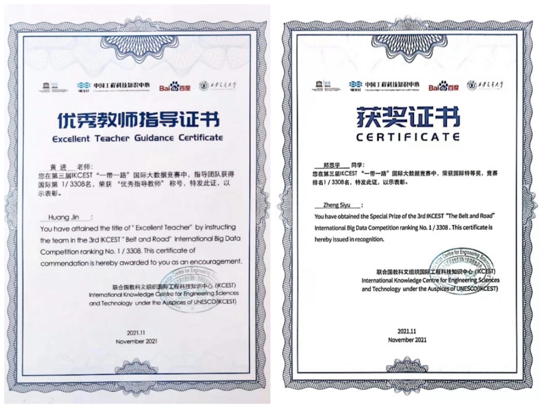 Recently, the 2021 IKCEST 3rd “the Belt and Road” International Big Data Competition and the 7th Baidu & Xi’an Jiaotong Big Data Competition came to an end. The team under the guidance of Mr. Huang Jin from the School of Electrical Engineering, won the International Grand Prize, with the first place in real-time and accuracy of deep vision model among 3308 participating teams.